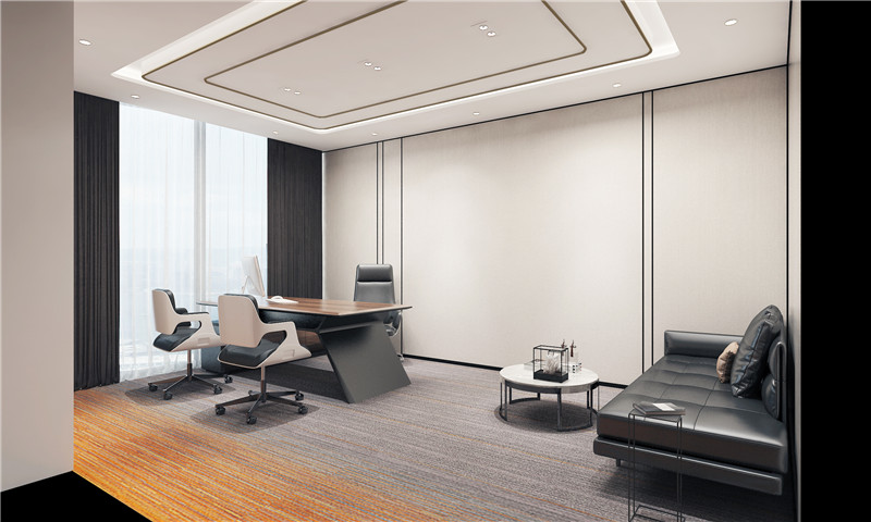 中小新型公司在办公室装修的时候,会更多的偏向于现代型的办公室装修风格。而董事长的办公区域就会在这种风格上加以深入以简单造型取精细,以巧思设计亮眼球,在有限的空间里,延伸出无限的活力与朝气。某公司现代简约风格的董事长办公室设计:整体设计以时尚、流畅、实用的格局为主线,屋内原木办公桌,简洁的吊灯,墙体的装饰画和黑色栅栏隔断,凸显安静的自然感。净色地板和墙体颜色形成反差,映衬出一种稳重和时尚感。